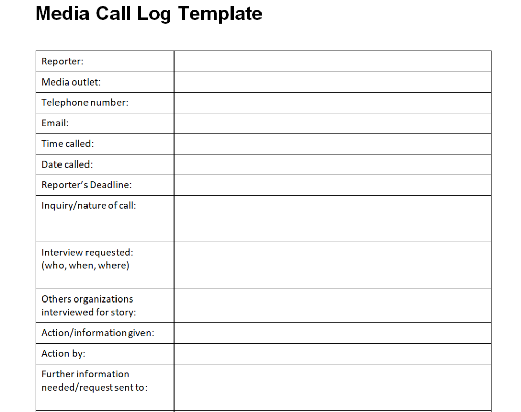 Media Call Log Template in MS WORD