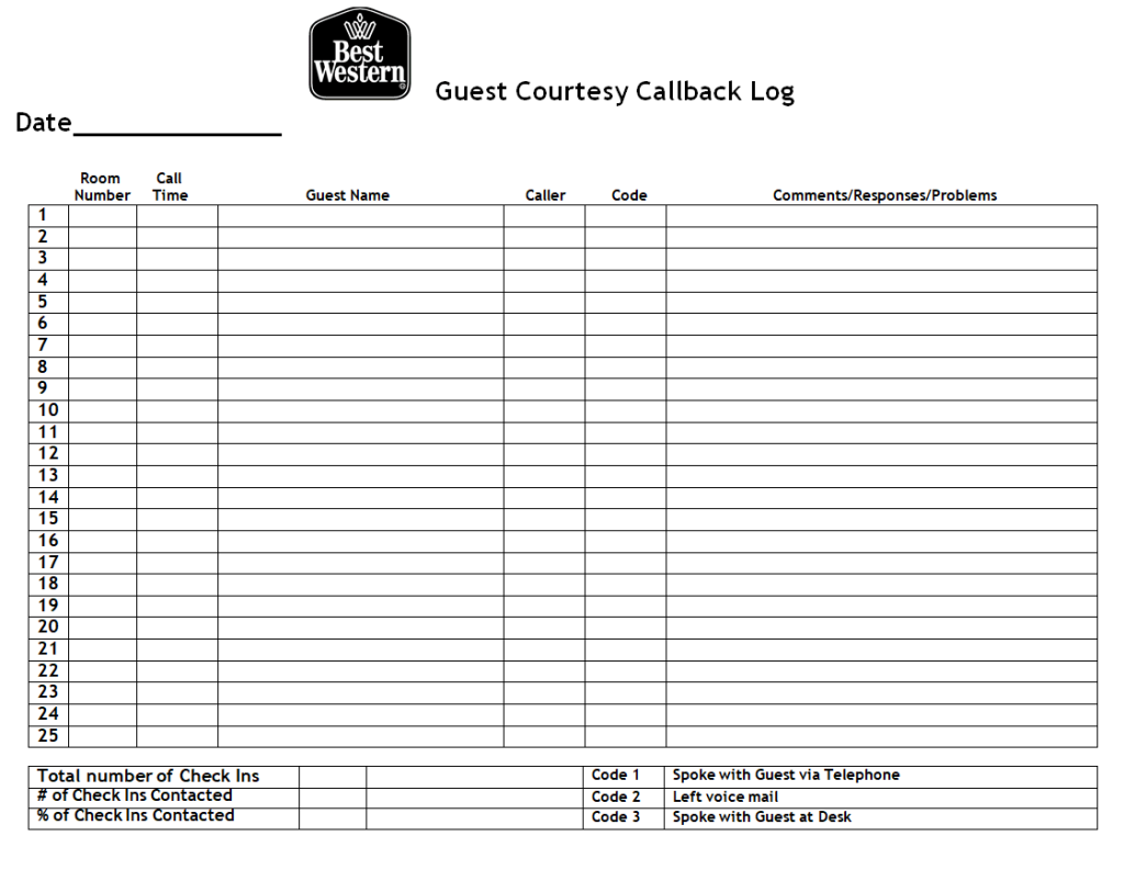Hotel Guest Courtesy Callback Log Sheet Template