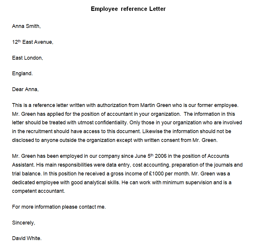 Employee Character Reference Letter Word Template