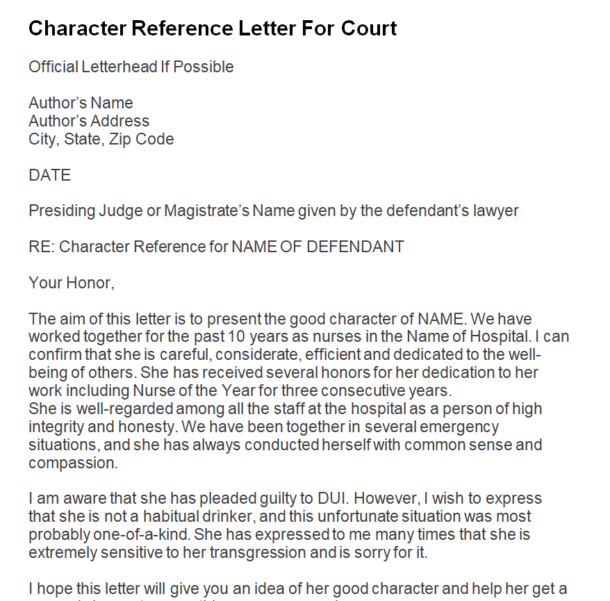 Character Reference Letter Template for Court