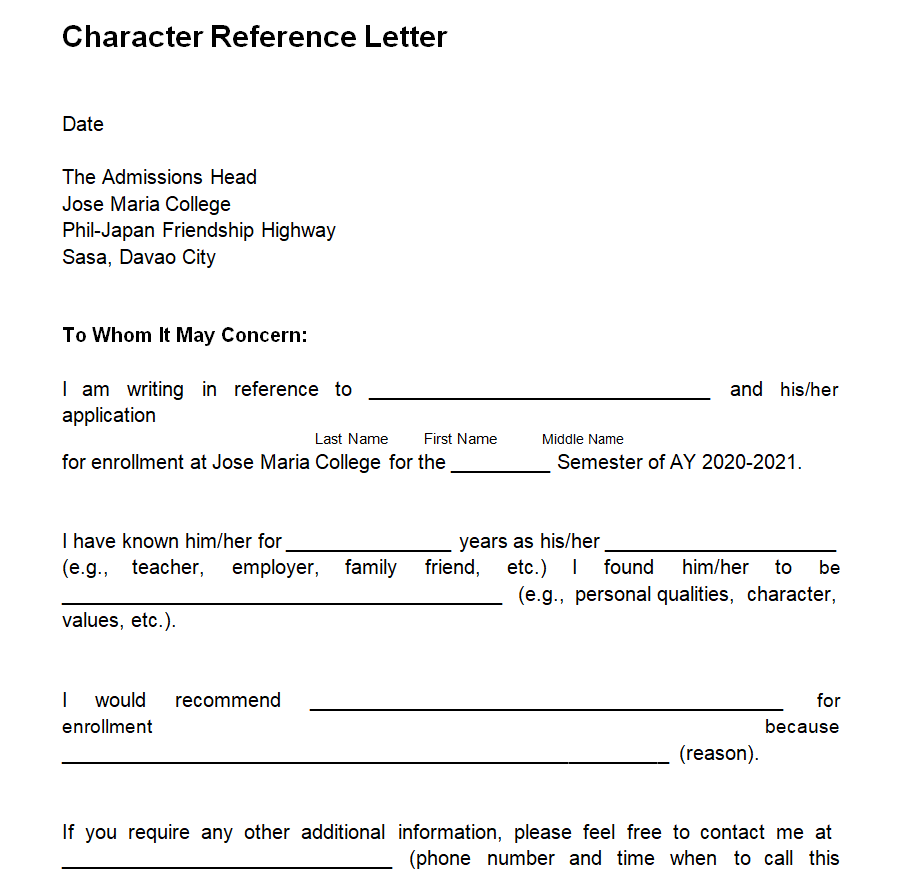 Fillable Character Reference Letter Word Template