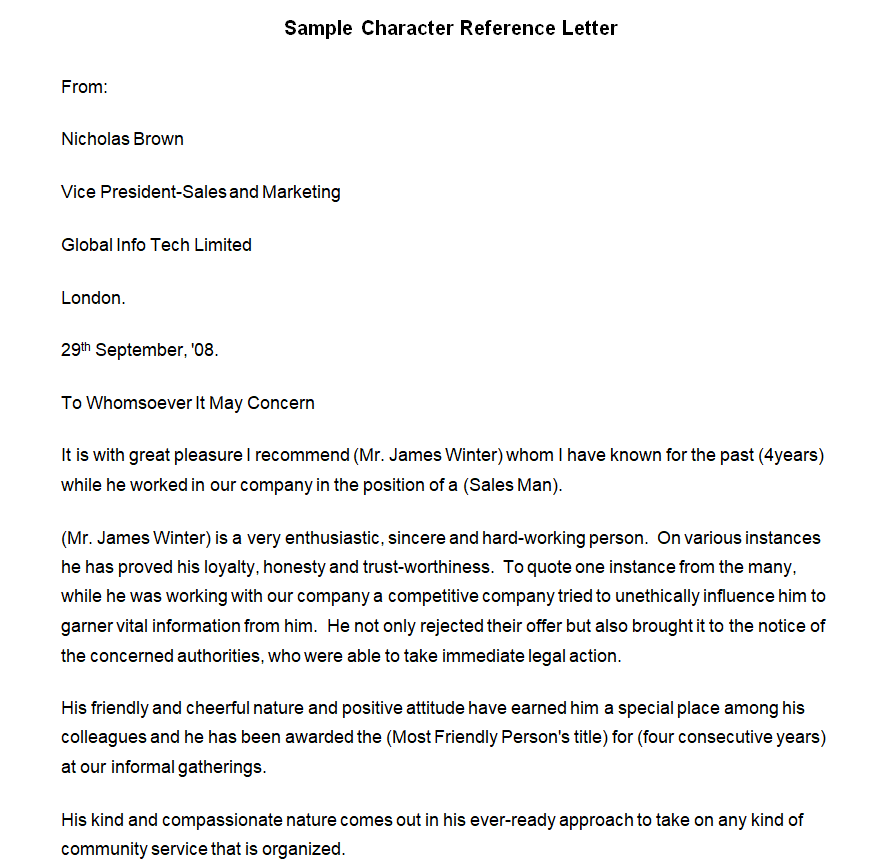 Sample Character Reference Letter Example