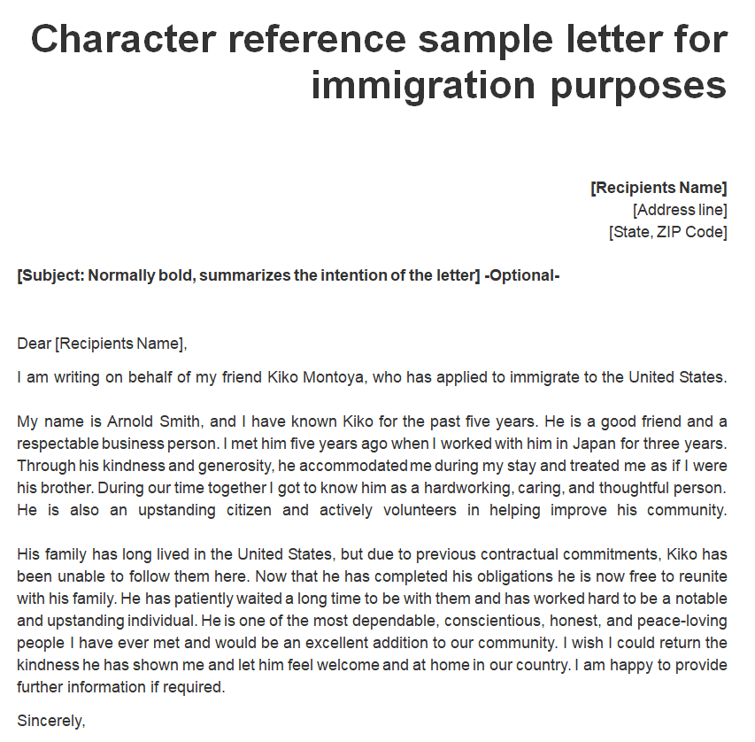 Character Reference Letter Sample for Immigration Purposes