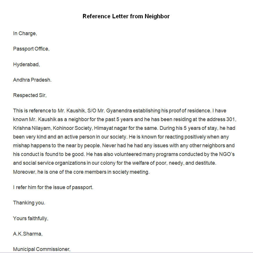 Sample Character Reference Letter from Neighbor