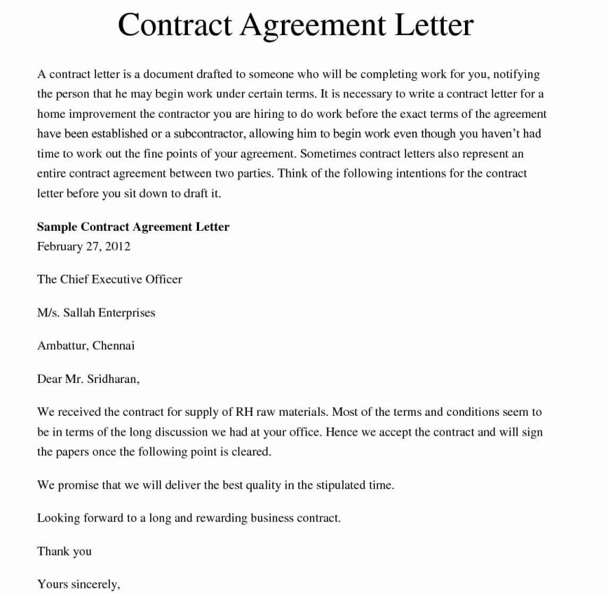 - A contract agreement letter can also be written in the case of construction contracts. One party may write the letter to verify the fact that the other party also agrees to the terms and conditions of the construction contract such as the scope of work, payment terms, completion date, etc.