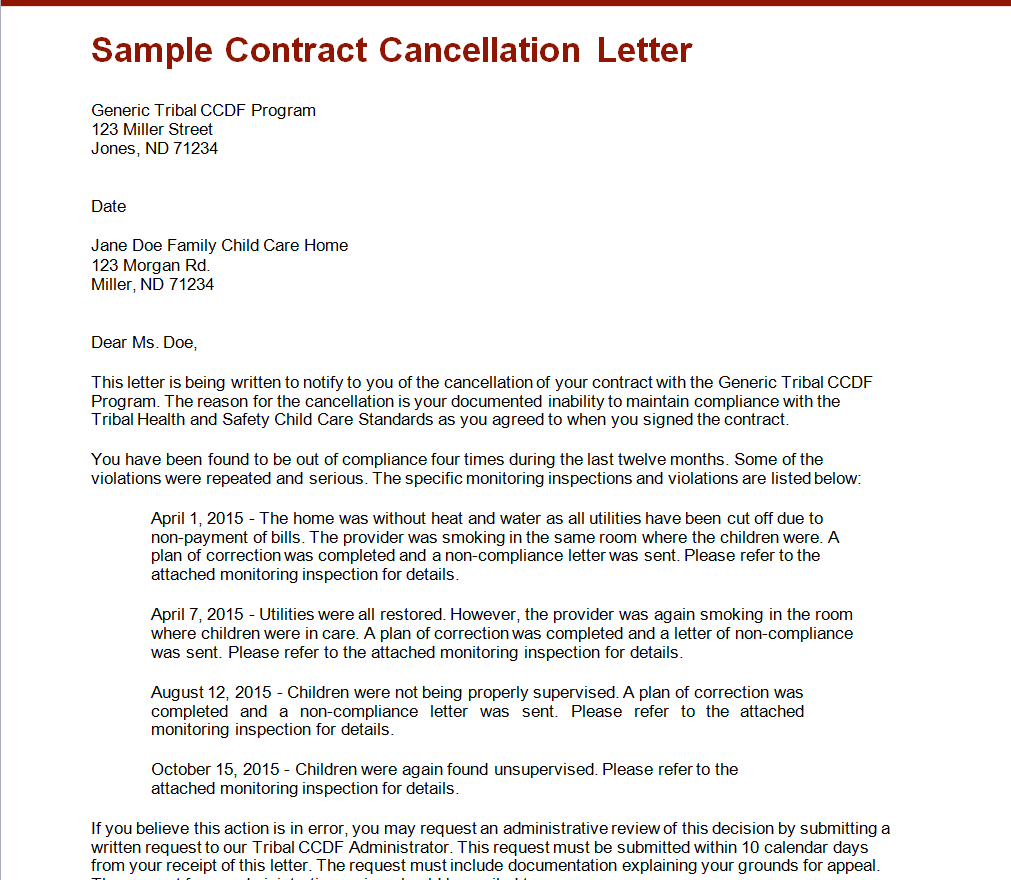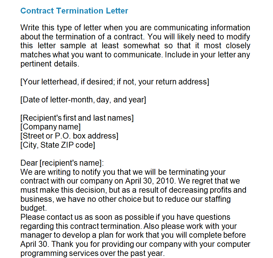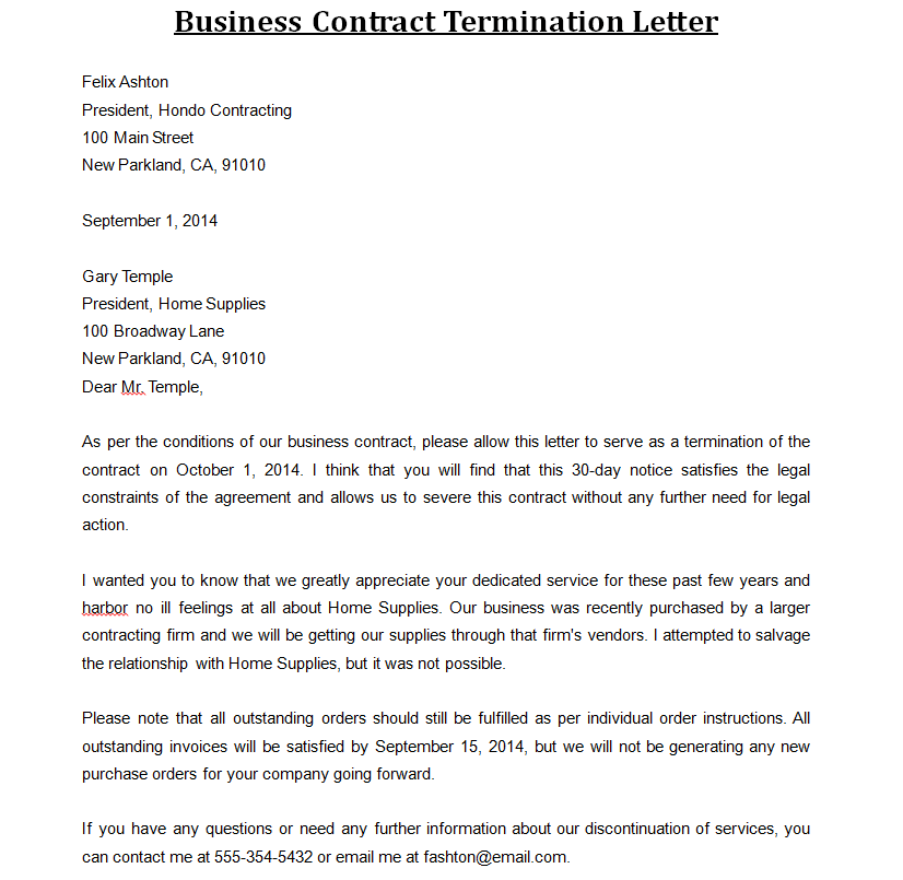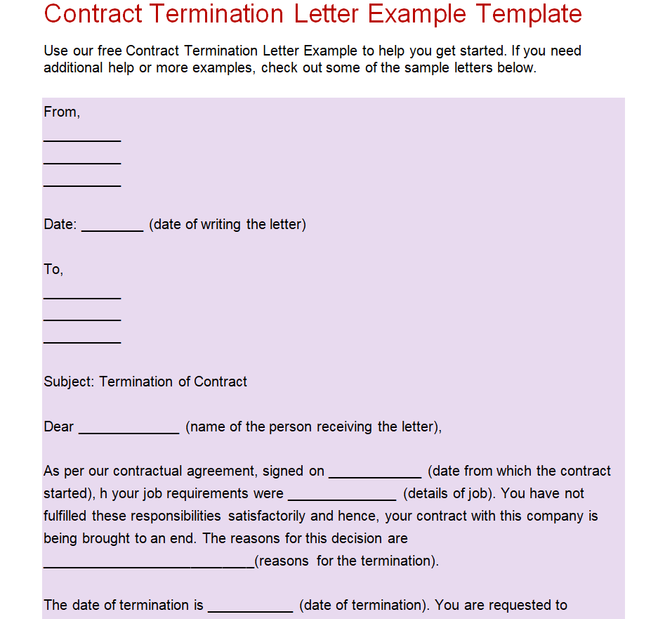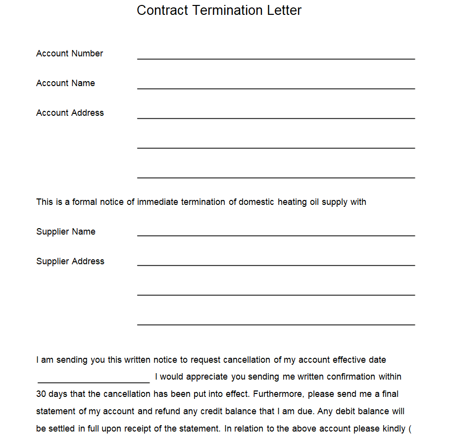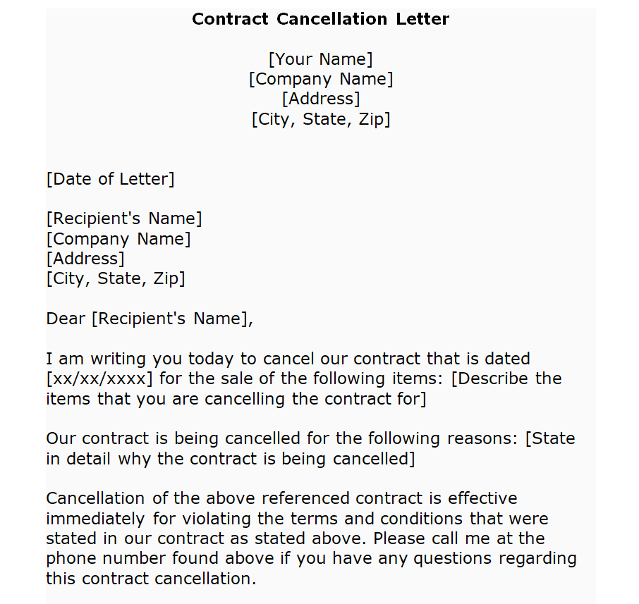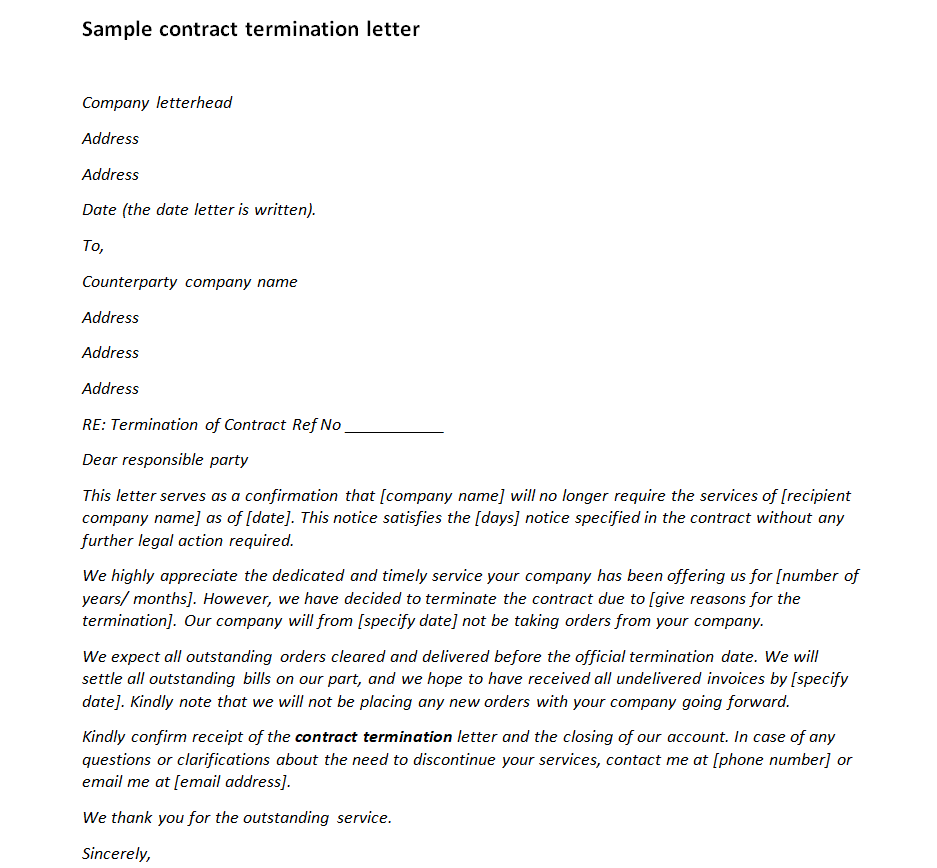 Whenever you want to terminate a contract, you should write a contract termination letter and you can write an effective one simply with the help of sample contract termination letter templates that we have provided right here on this page for you. Almost every type of contract has a termination clause that allows the parties to the contract to terminate the contract as per its provisions upon which the parties agreed earlier. A contract termination letter enables you to communicate your decision of terminating the contract to the other party or parties involved in the contract. For this, you have to write a professional-looking letter using a standardized format, and using the premade contract termination letter templates is the best option to consider especially if you don’t know how to craft this type of letter or simply you don’t have enough time to write one.