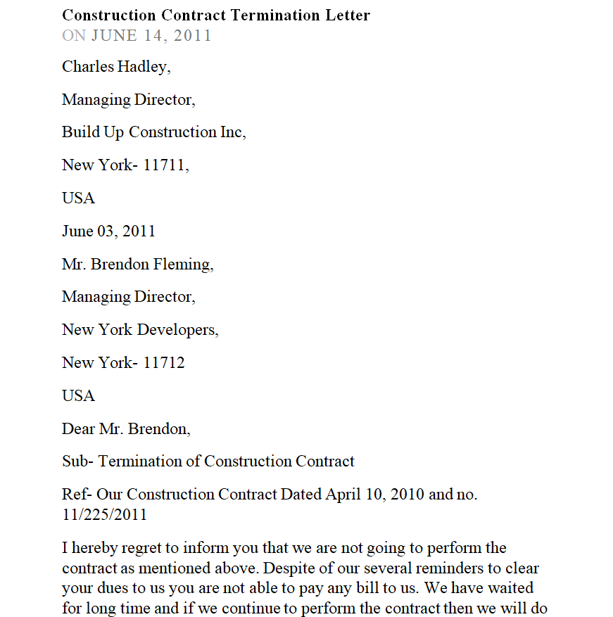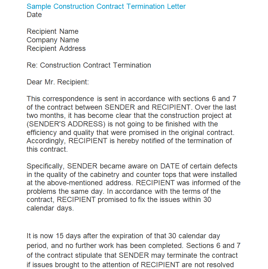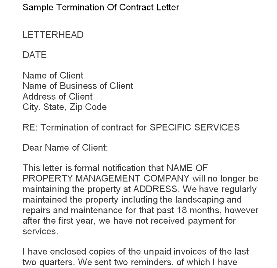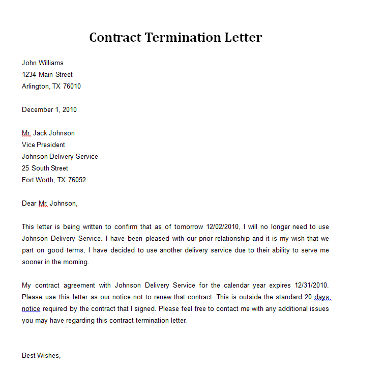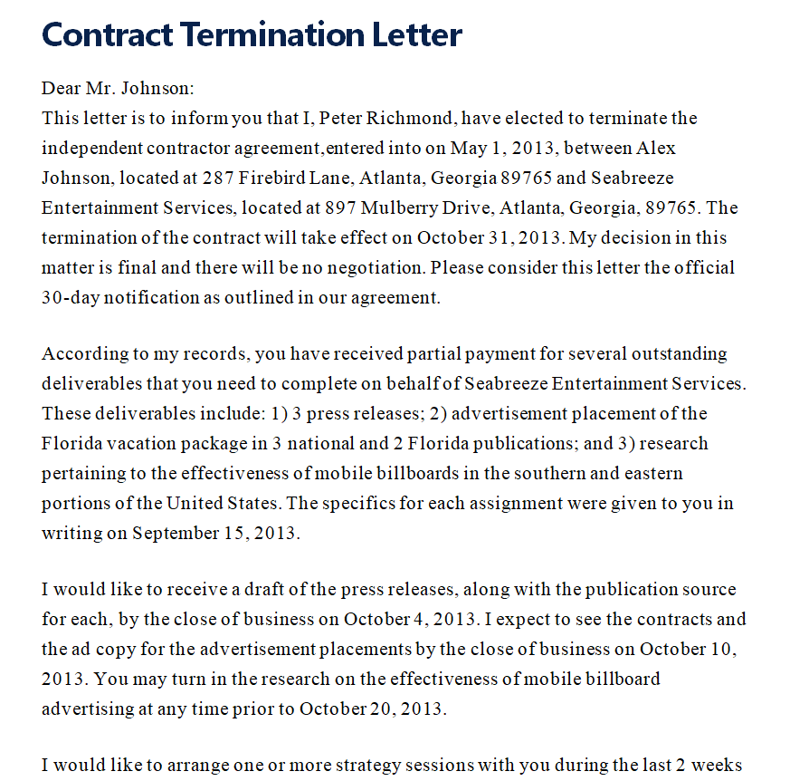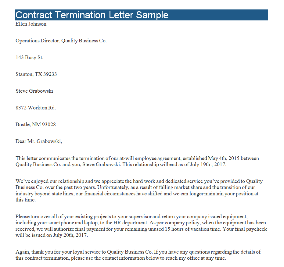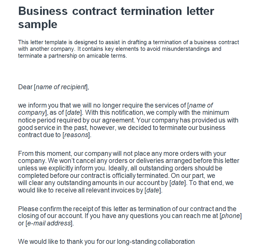 Whenever you want to terminate a contract, you should write a contract termination letter and you can write an effective one simply with the help of sample contract termination letter templates that we have provided right here on this page for you. Almost every type of contract has a termination clause that allows the parties to the contract to terminate the contract as per its provisions upon which the parties agreed earlier. A contract termination letter enables you to communicate your decision of terminating the contract to the other party or parties involved in the contract. For this, you have to write a professional-looking letter using a standardized format, and using the premade contract termination letter templates is the best option to consider especially if you don’t know how to craft this type of letter or simply you don’t have enough time to write one.