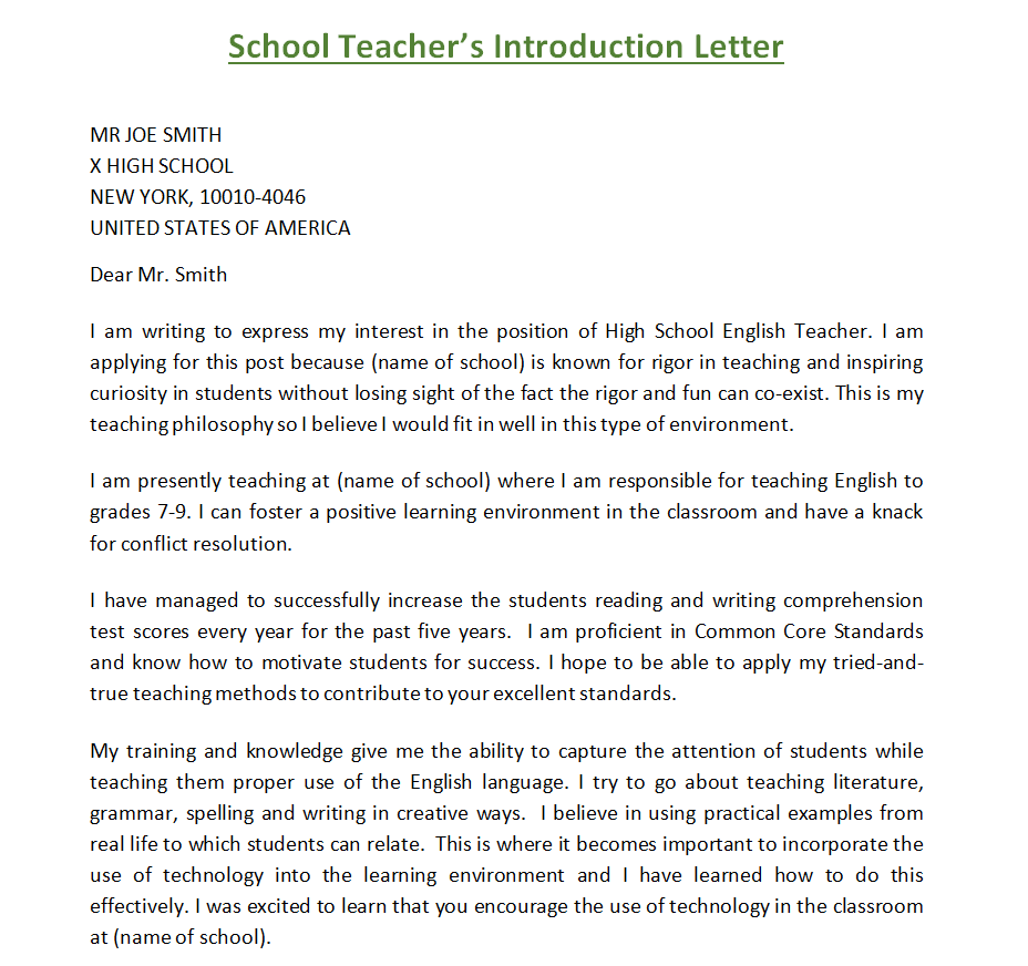 School Teacher’s Introduction Letter Sample