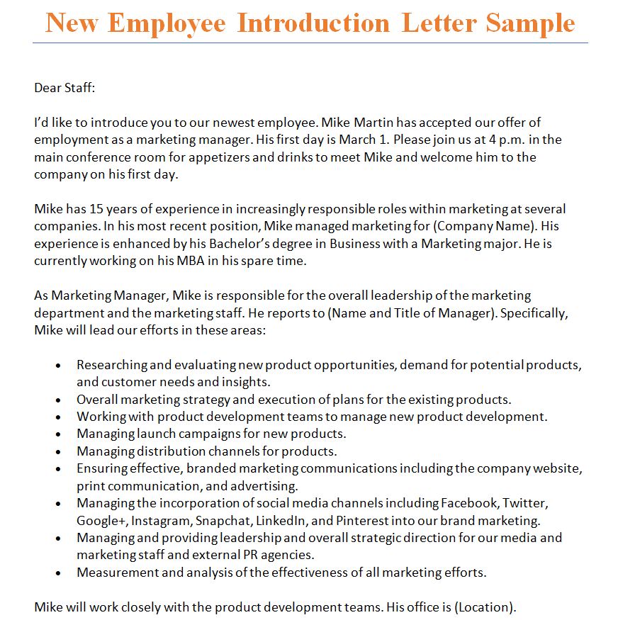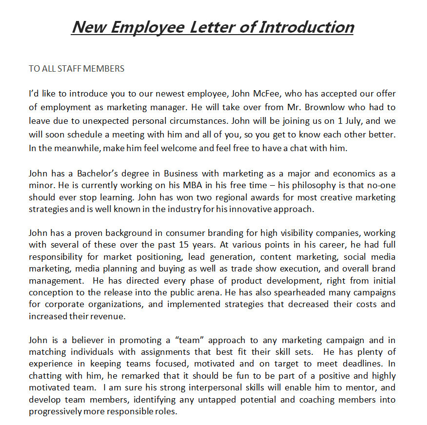 Standard New Employee Introduction Letter Sample in MS WORD