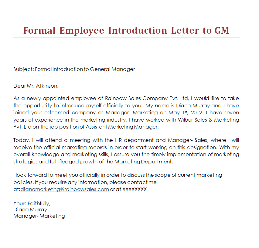 Formal Employee Introduction Letter to General Manager