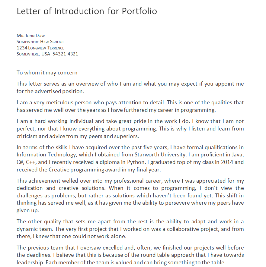 Employee Portfolio Introduction Letter Sample