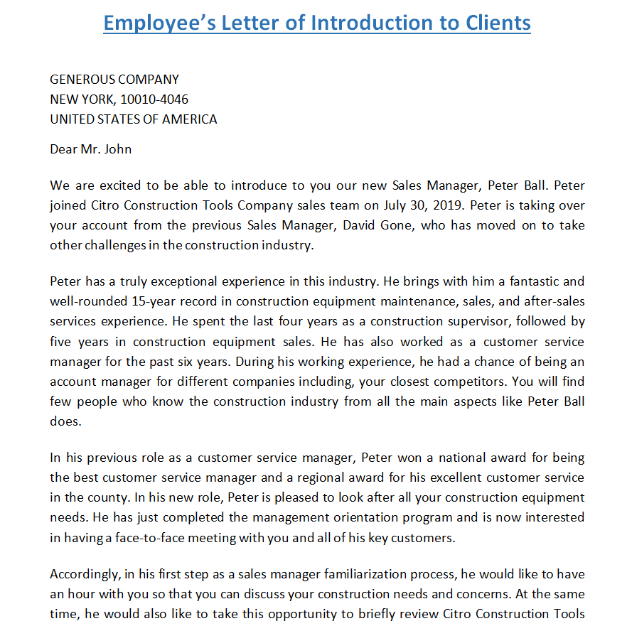 Employee’s Letter of Introduction to Clients Template