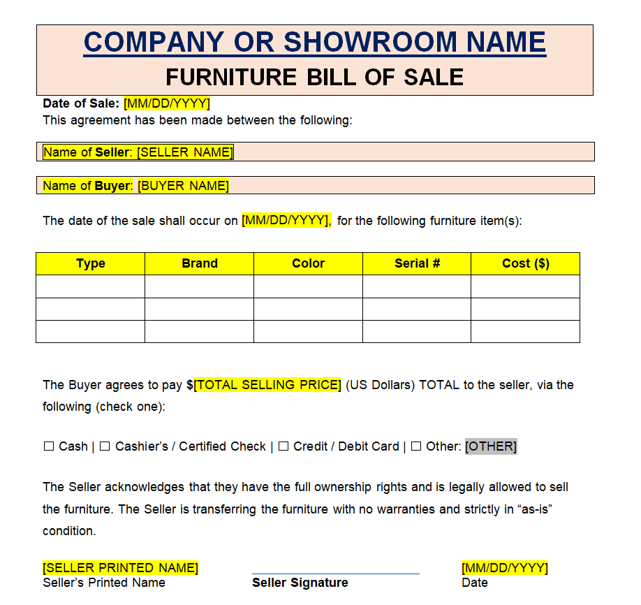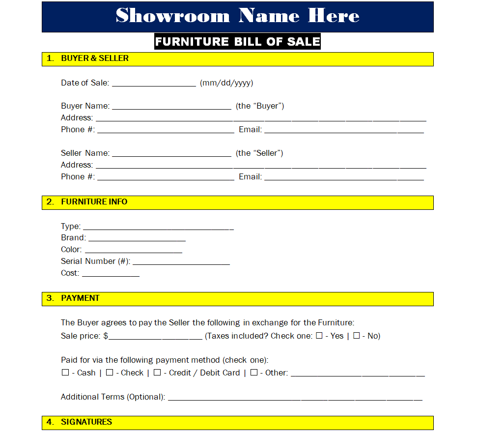 Showroom’s Furniture Bill of Sale Example in MS WORD