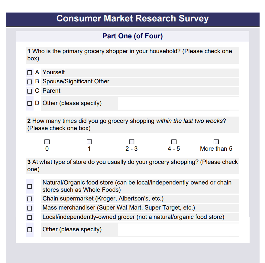 Consumer market research questionnaire just like the one given below are used by many organizations such as grocery stores. These organizations conduct surveys to evaluate the satisfaction of their consumers relating to their products or services with the help of such questionnaires. These surveys help them devise important strategies for the future so that they can maximize customer satisfaction further with their products and services.