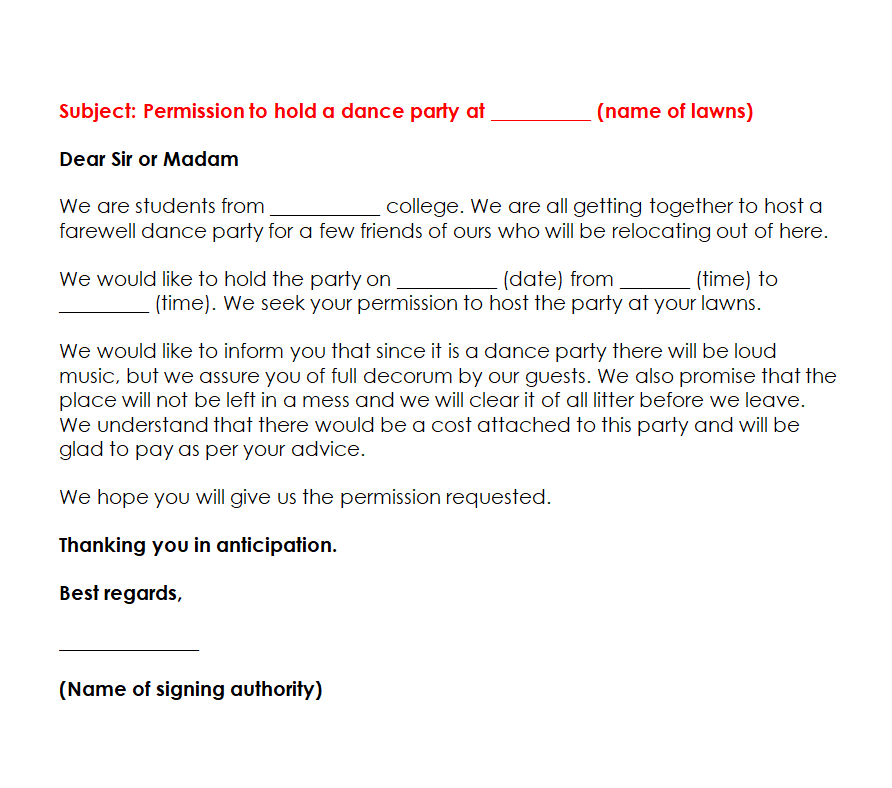 Permission Letter Template for a Dance Party