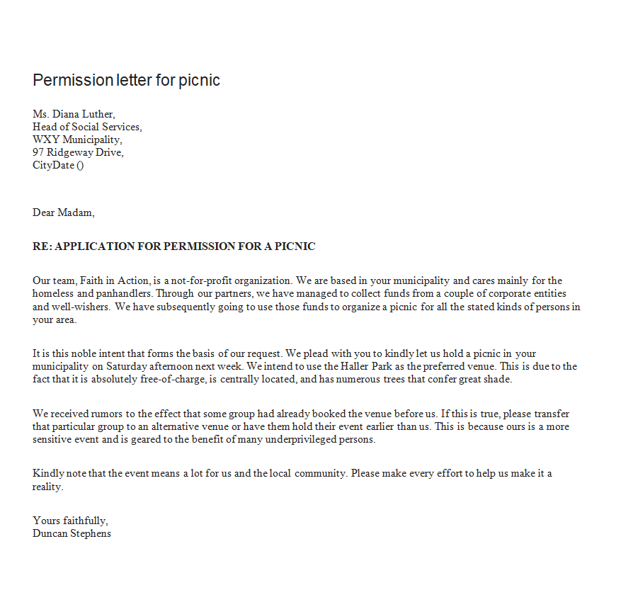 Sample Permission Letter Template for Picnic