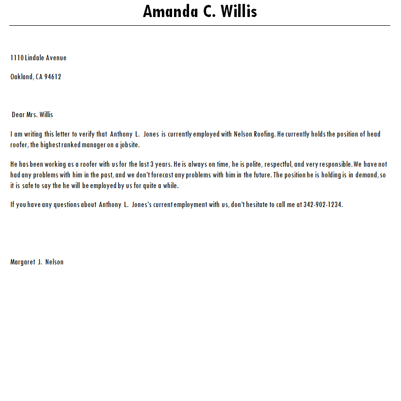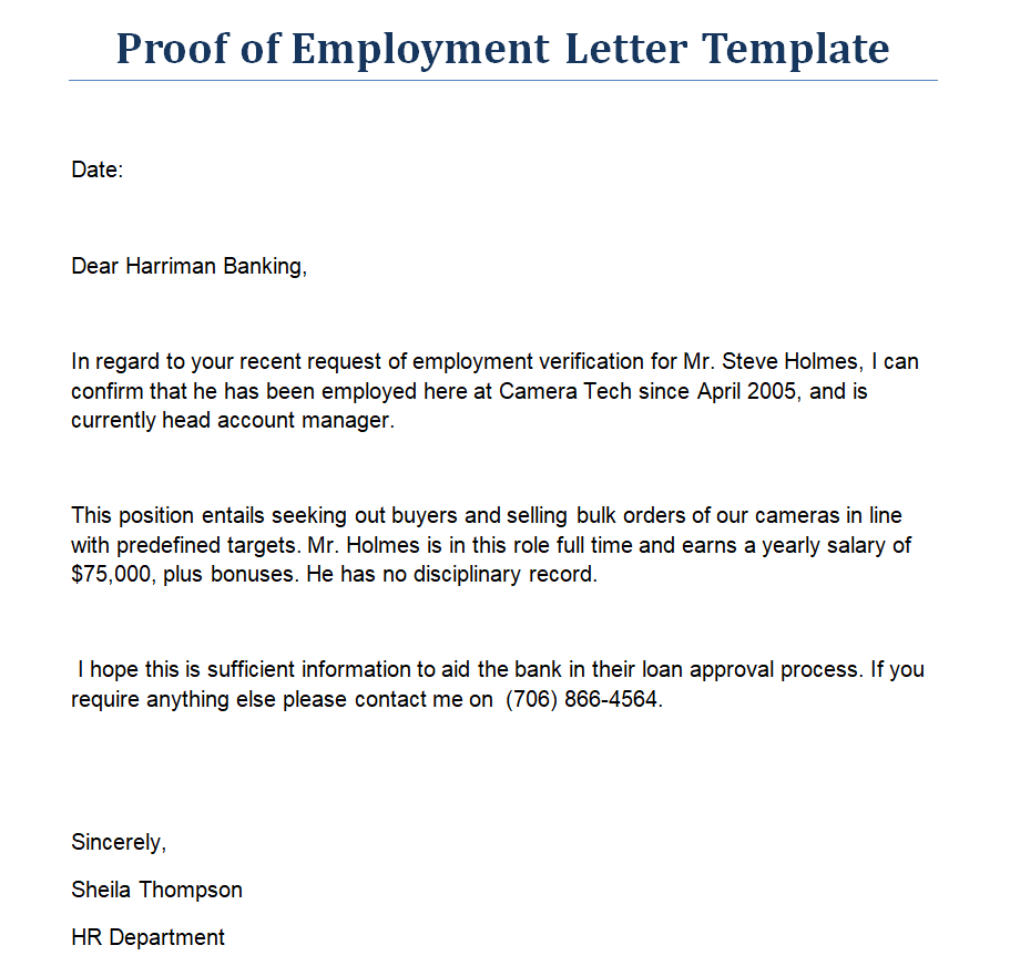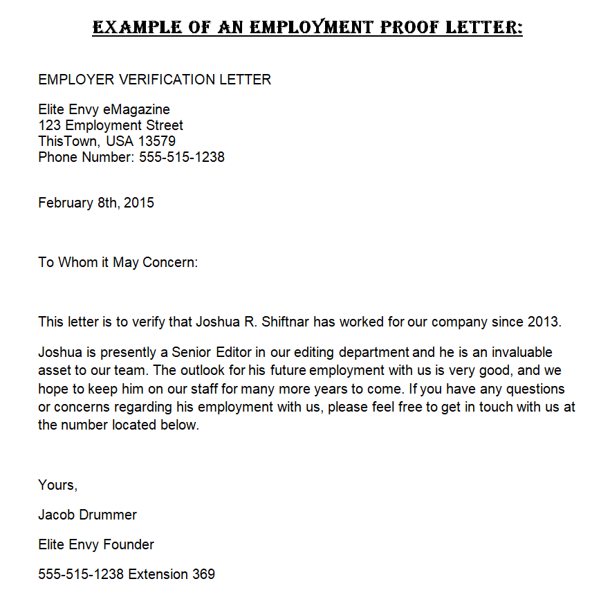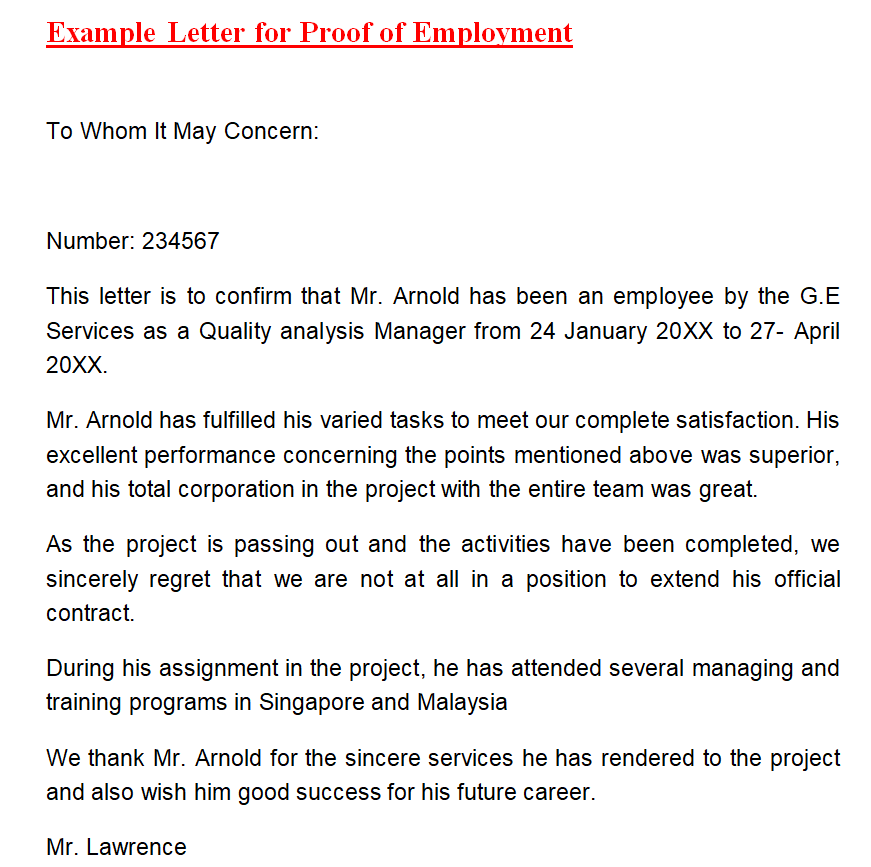 Letter for Proof of Employment Example