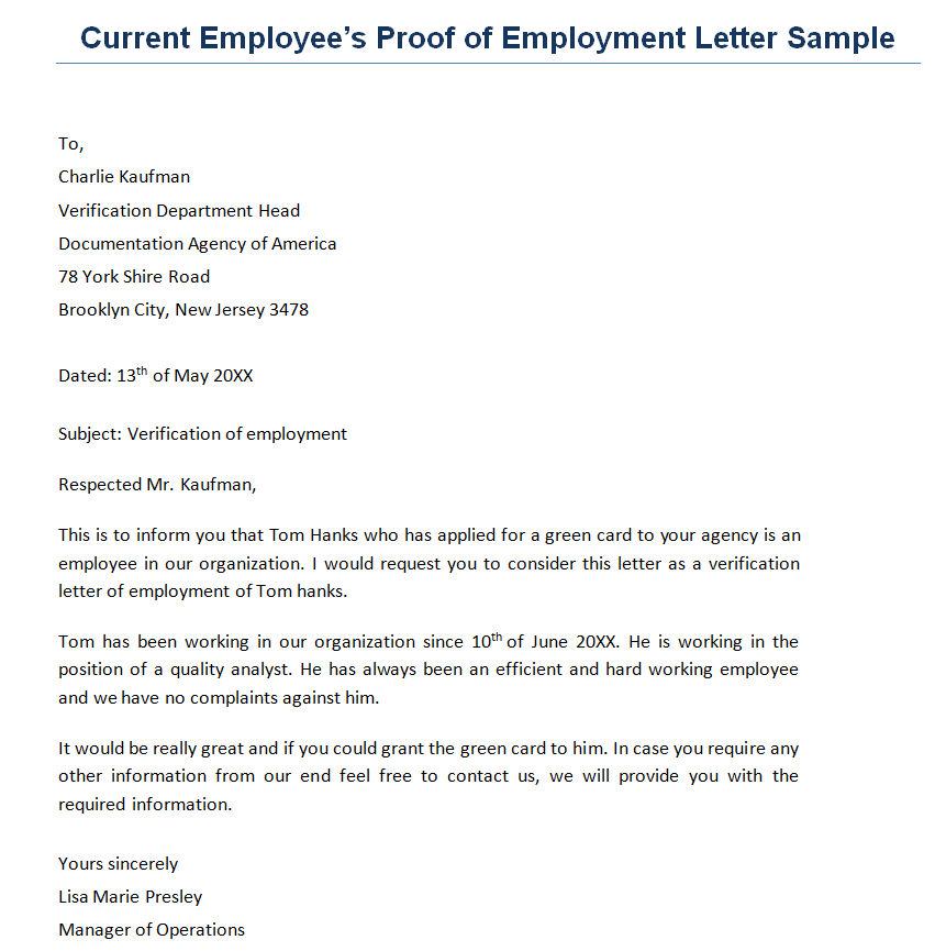 Current Employee’s Proof of Employment Letter Sample Doc