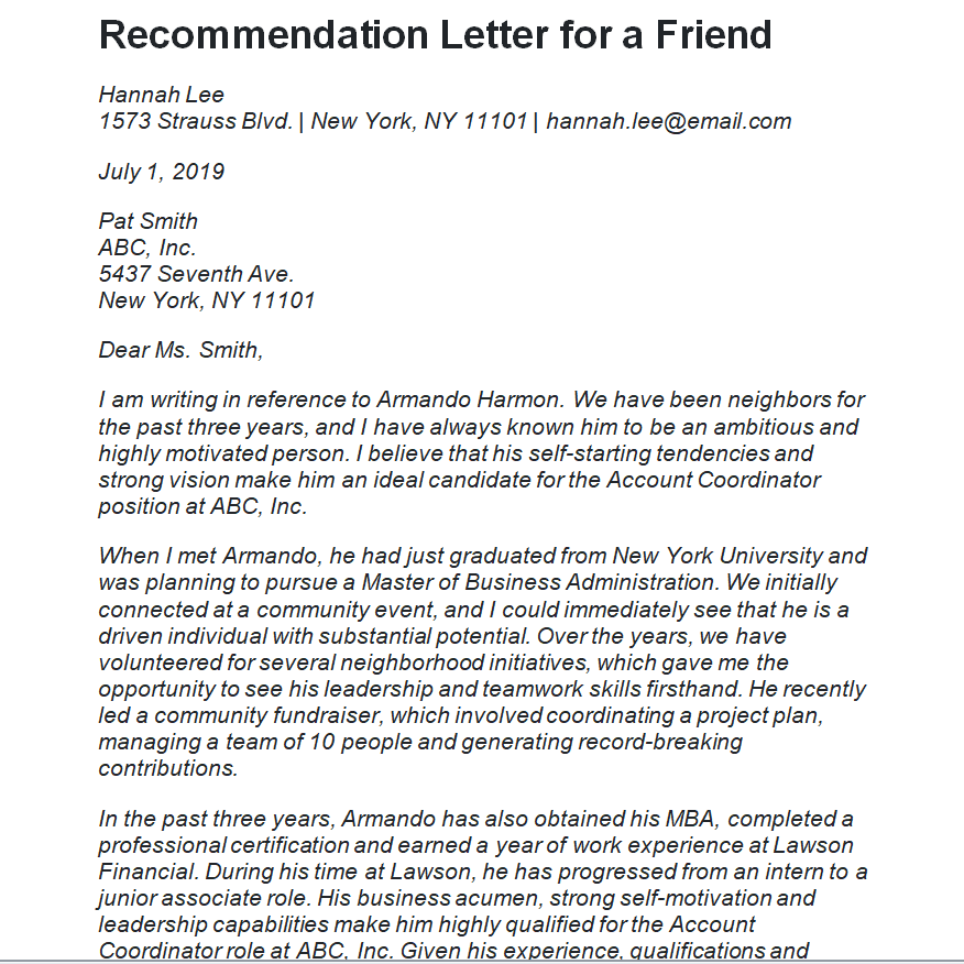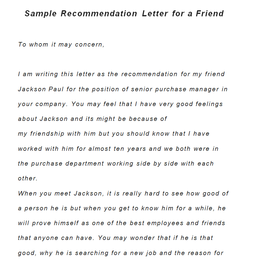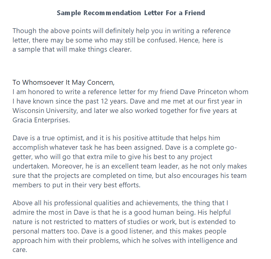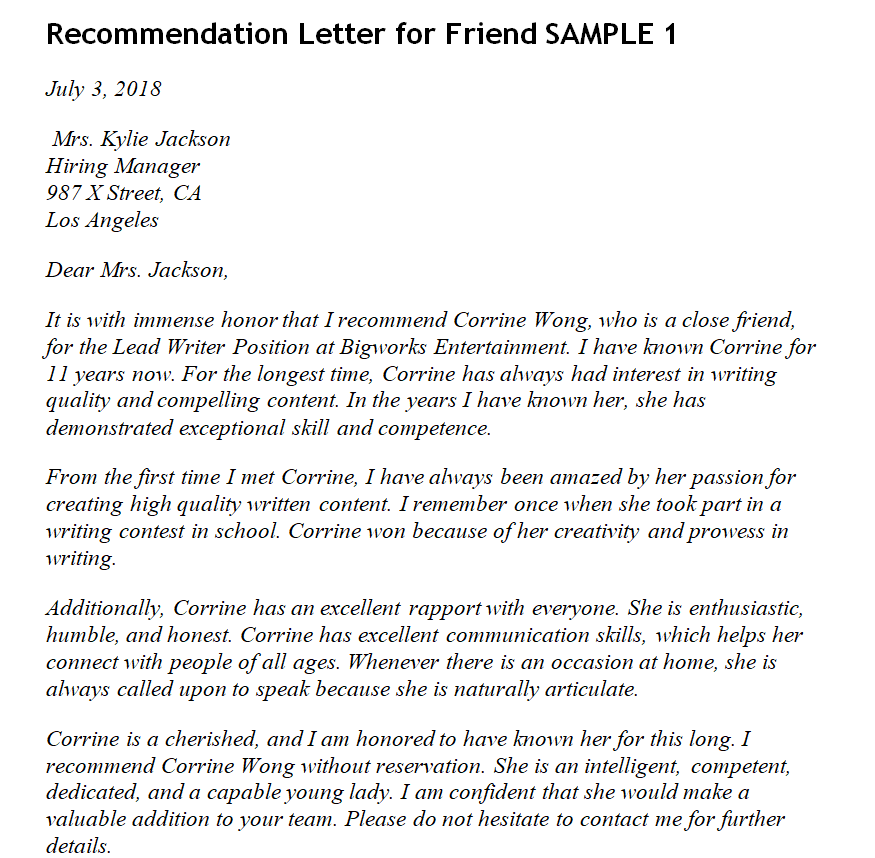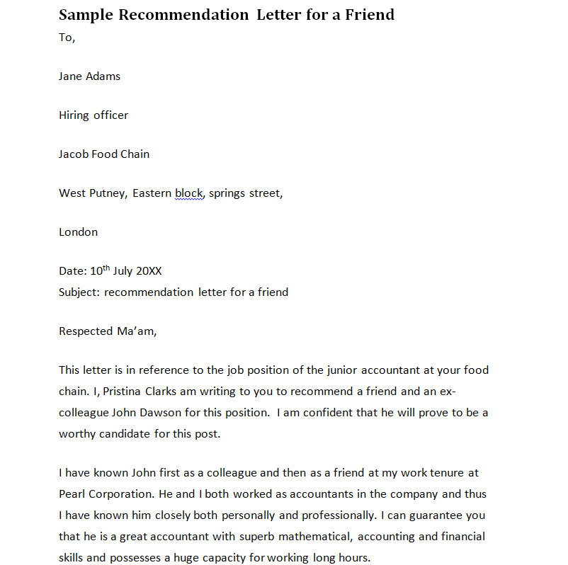 Sample Recommendation Letter for a Friend Example