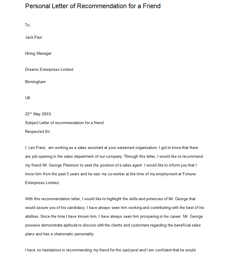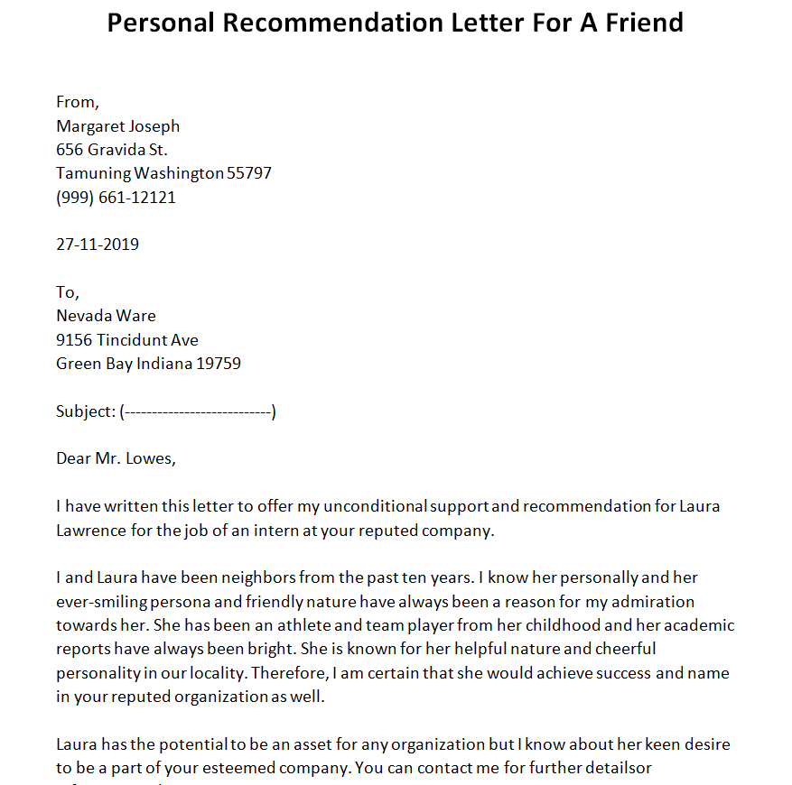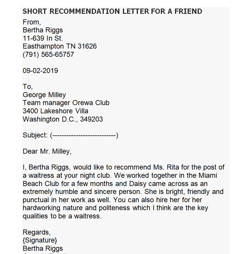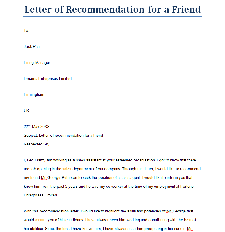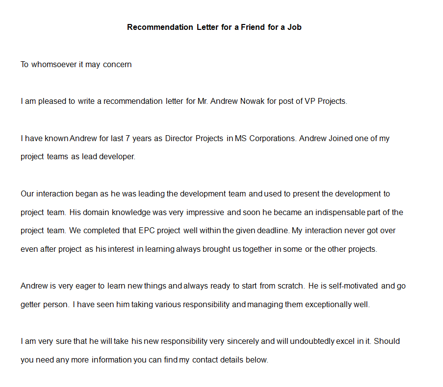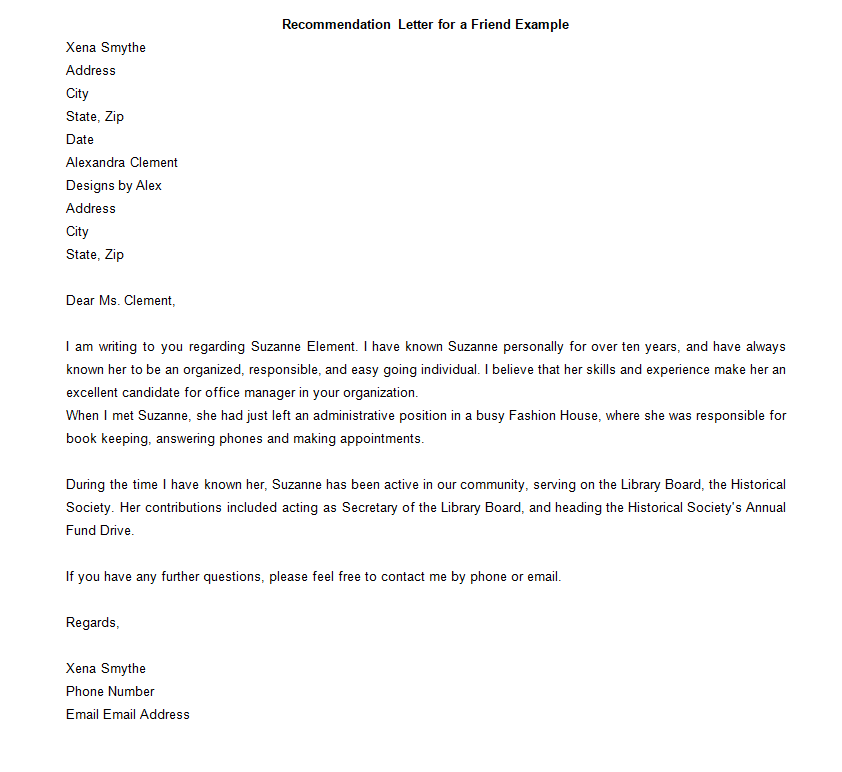 Sample Recommendation Letter for a Friend Example