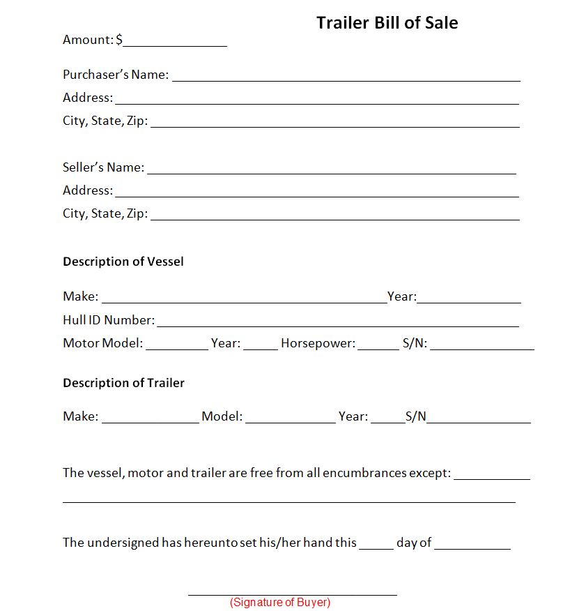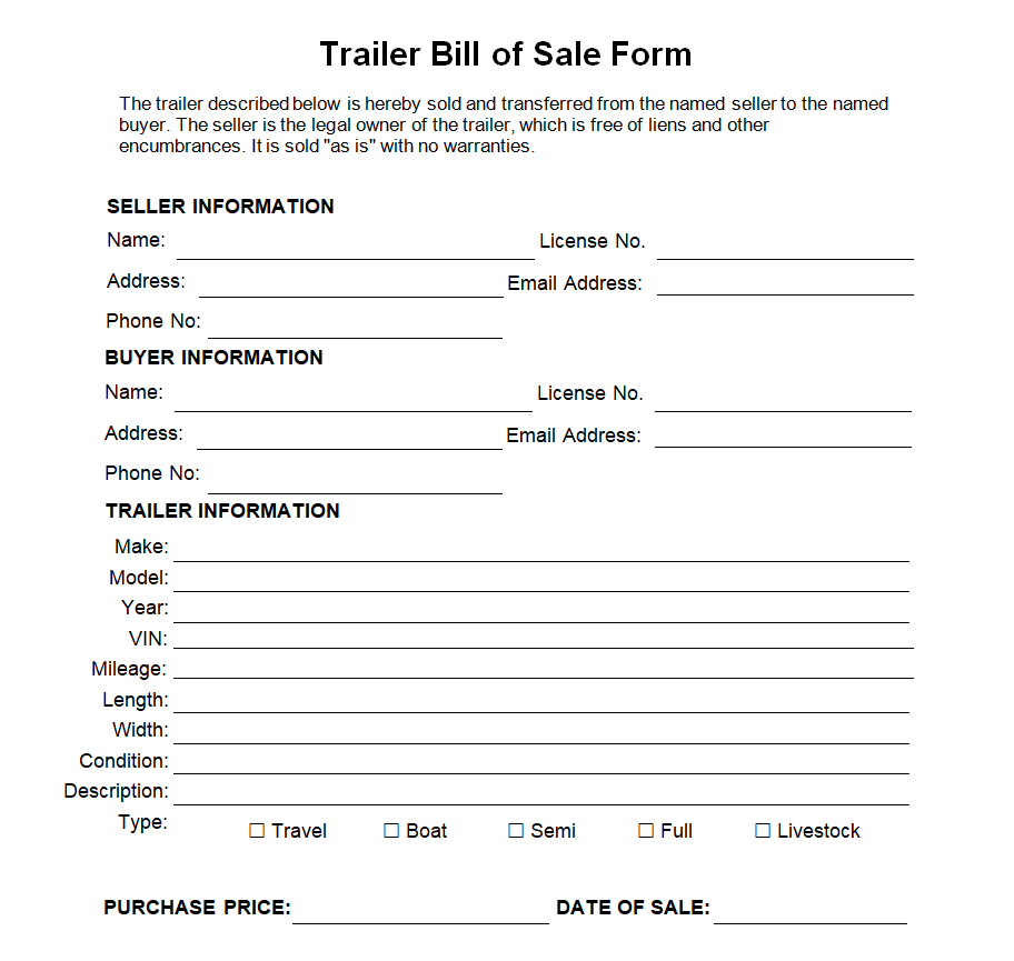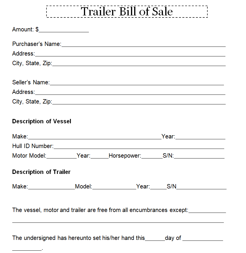 Free Printable Trailer Bill of Sale Form Template