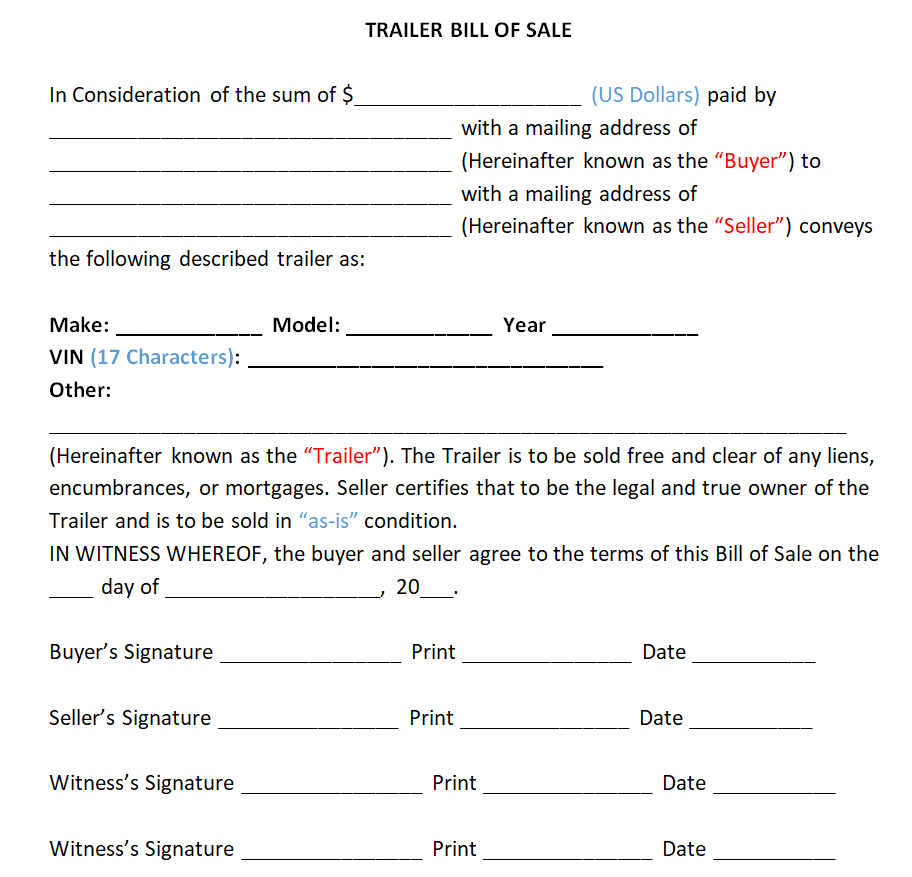 Fillable Trailer Bill of Sale Template