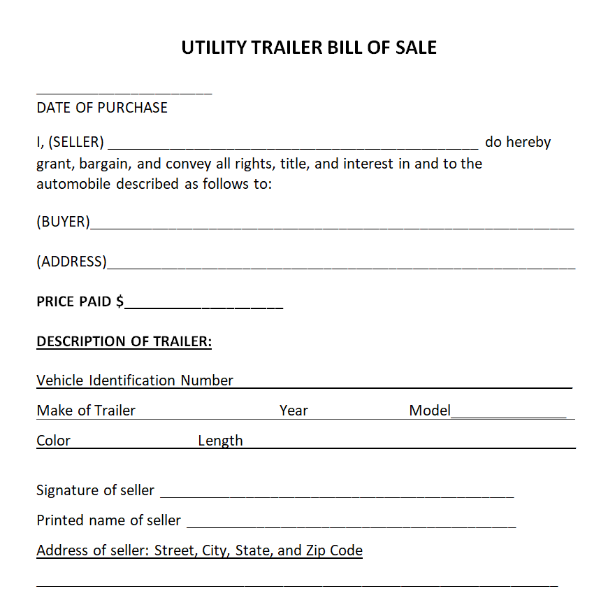Utility Trailer Bill of Sale Template