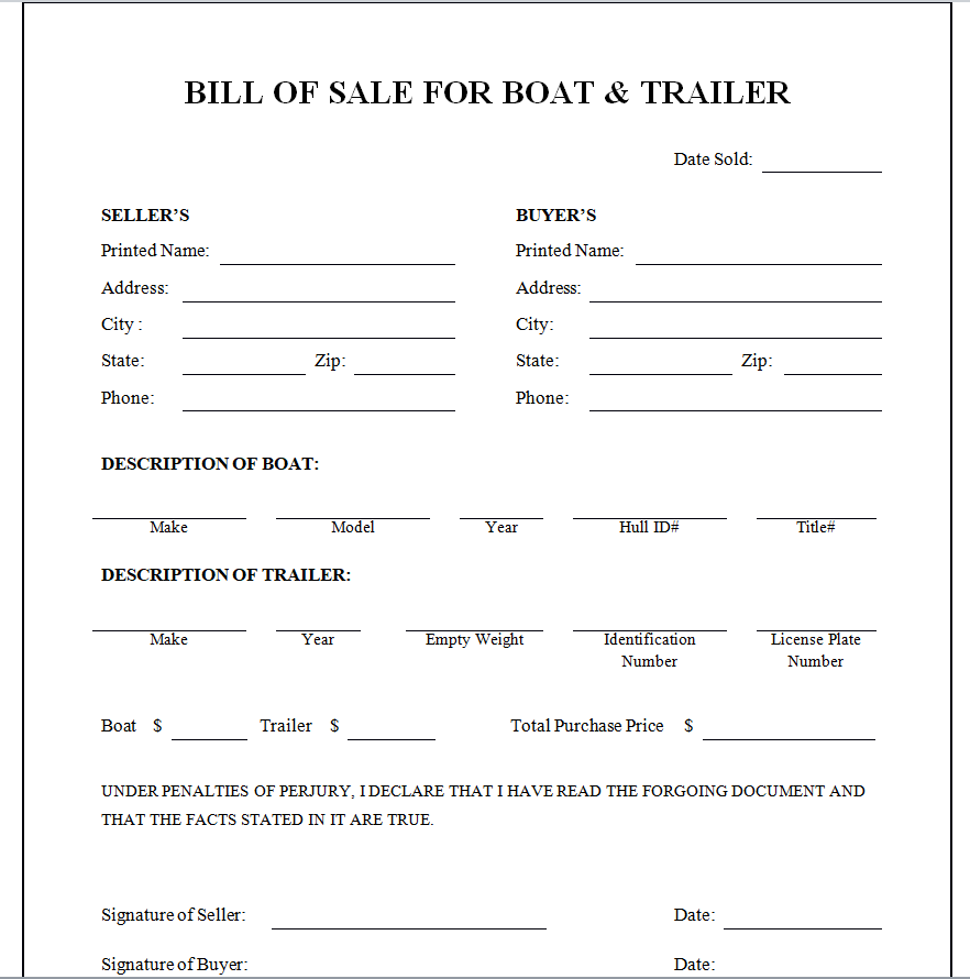 Bill of Sale for Boat & Trailer Template