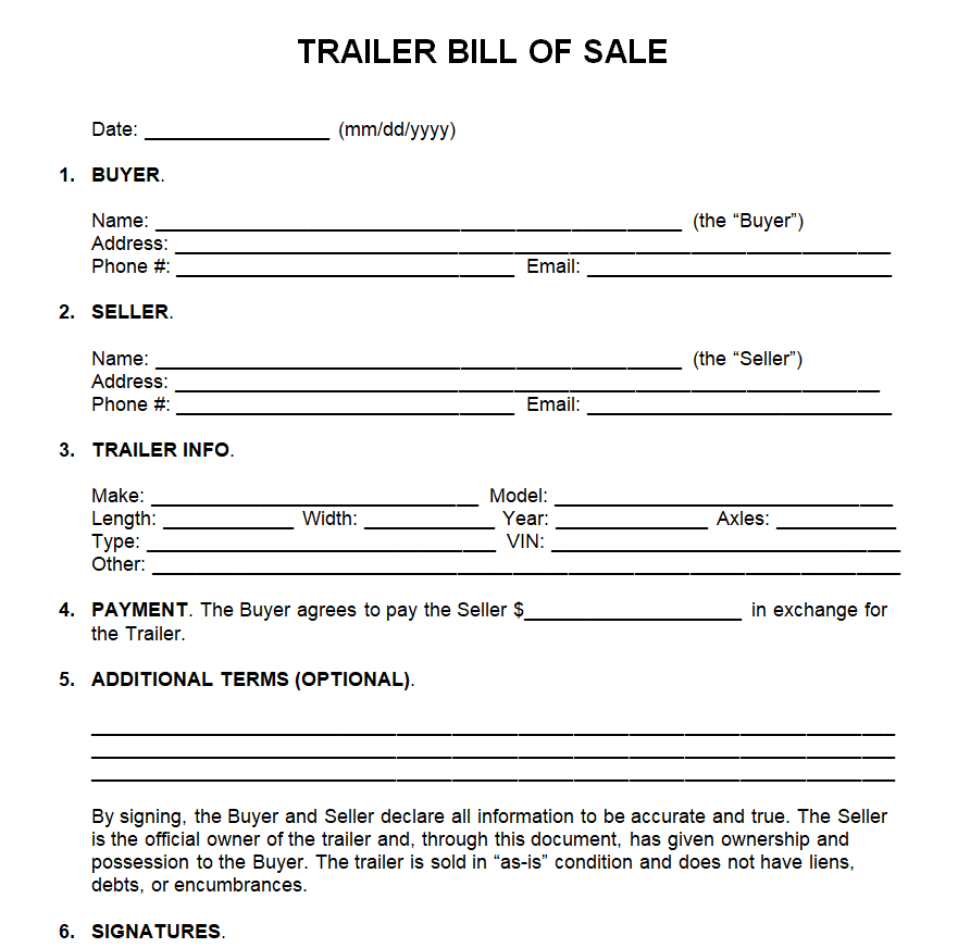 Standard Trailer Bill of Sale Template