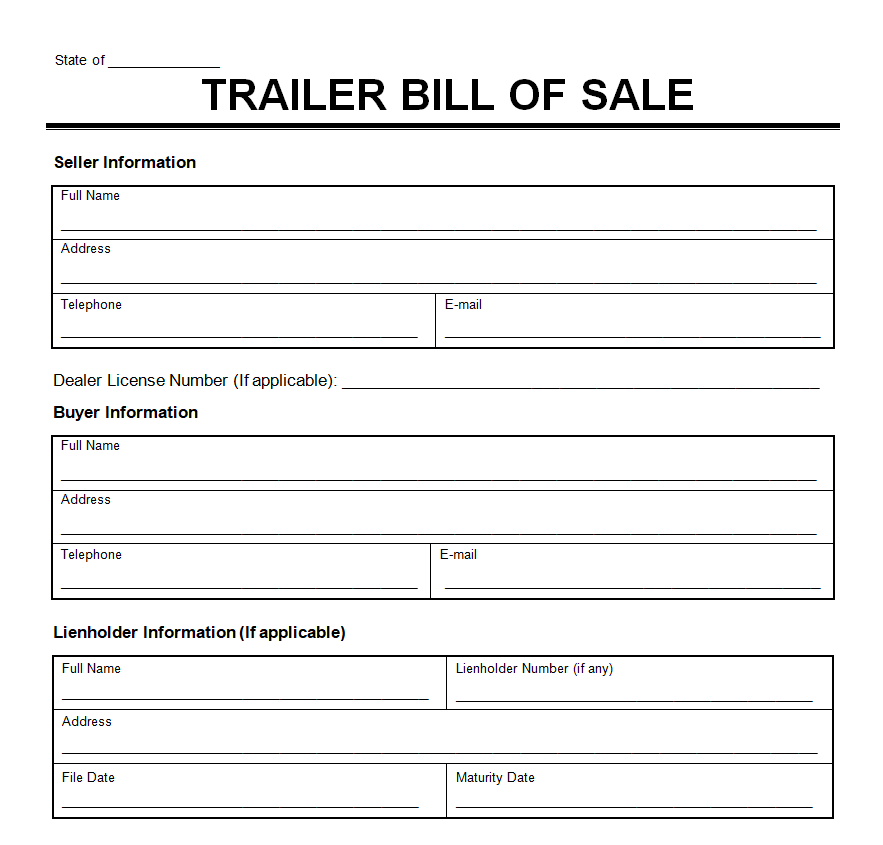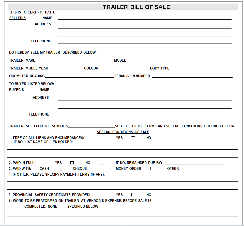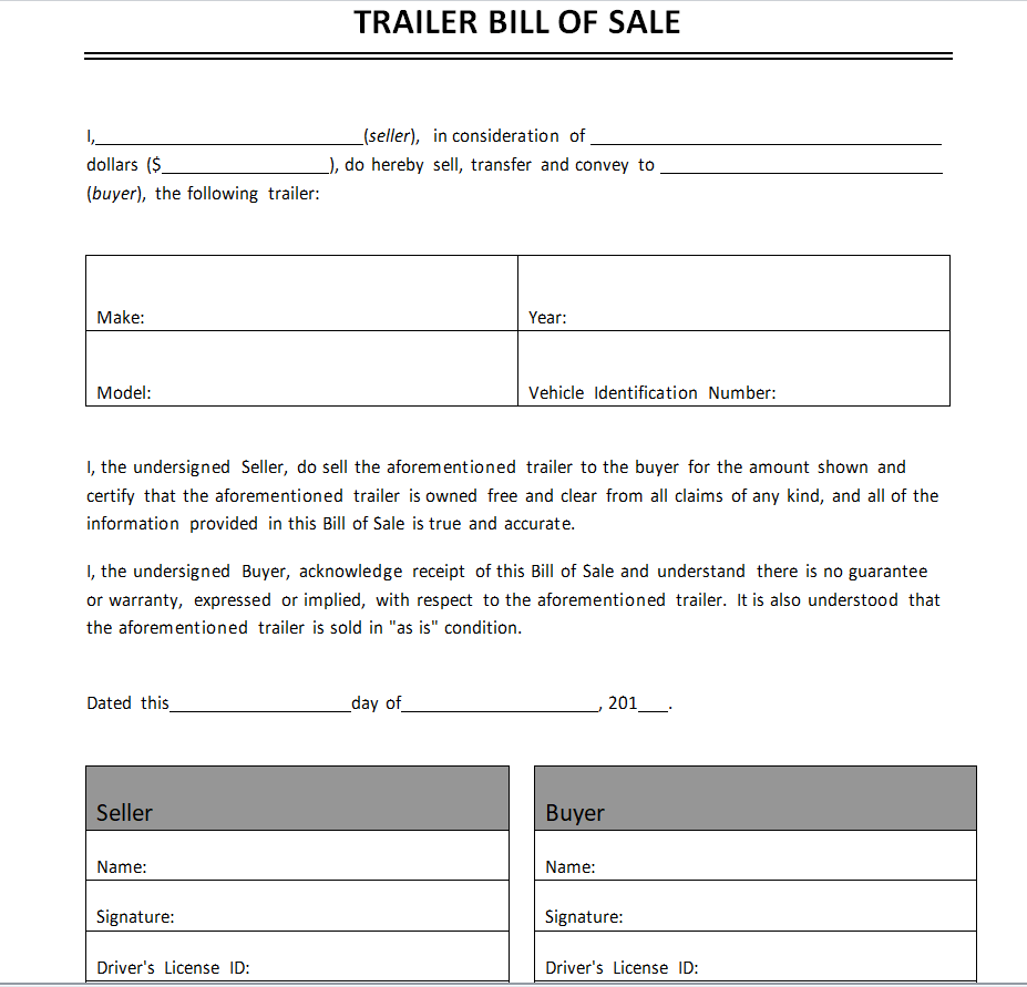 Blank Trailer Bill of Sale Word Template