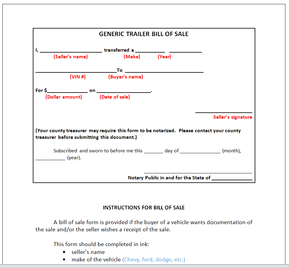 Generic Trailer Bill of Sale Template