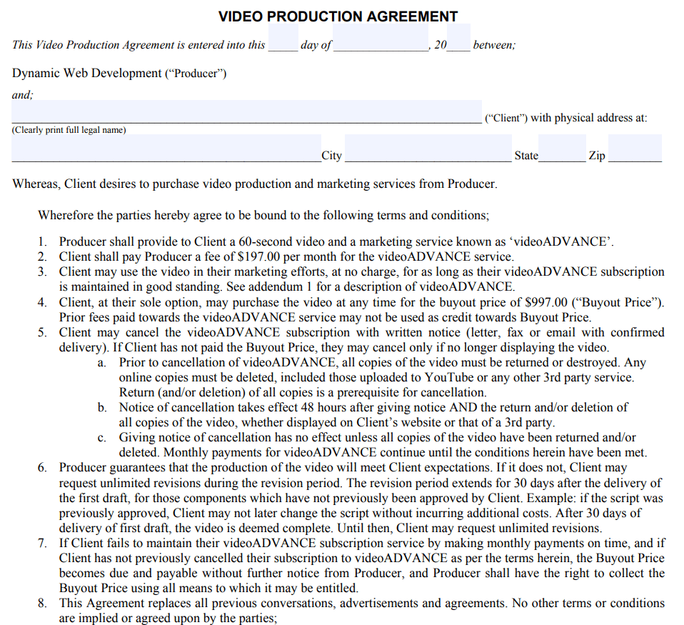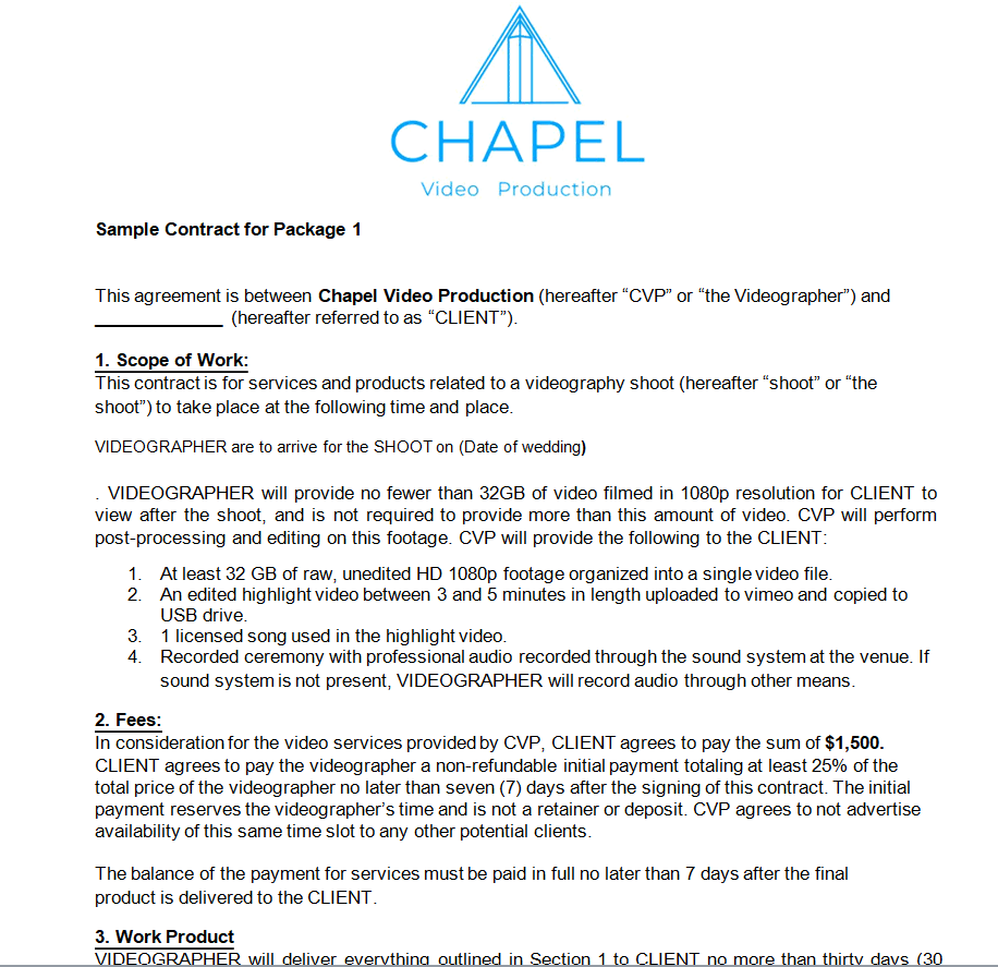 Our templates offer a comprehensive format that captures essential details and sets clear expectations for the project. From outlining the scope of work, project timeline, and deliverables to specifying the rights and ownership of the final product, our templates cover all the necessary components to ensure a successful videography collaboration. We understand that each videography project is unique, and our templates reflect that. They provide flexibility to accommodate specific requirements, such as shooting locations, equipment needs, and additional services. By utilizing our templates, you can customize the contract to align perfectly with your project’s demands while maintaining a professional and organized approach. In addition to the technicalities of the contract, our templates also emphasize the importance of maintaining a positive working relationship with clients. We have incorporated sections that outline communication protocols, revision processes, and dispute-resolution mechanisms to foster open and transparent collaboration. Our templates encourage clear and concise communication, setting the stage for a productive partnership from the beginning. Furthermore, these Videography Contract Templates not only protect your interests as a videographer but also provide reassurance to clients.