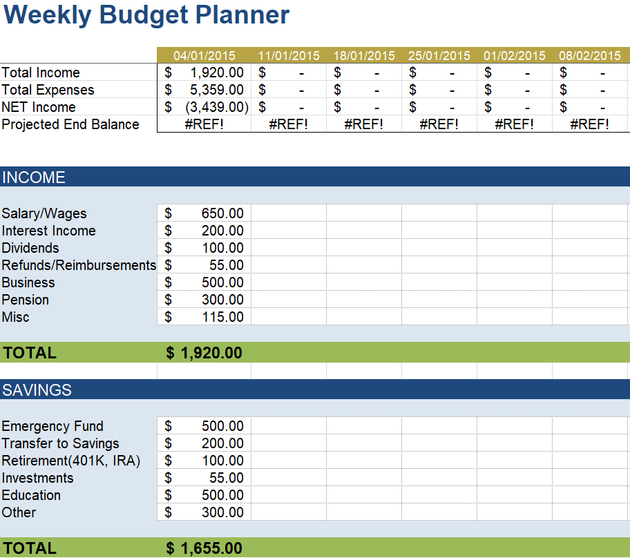 Standard Weekly Budget Planner Template