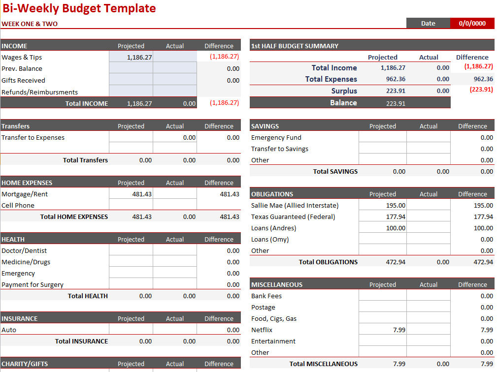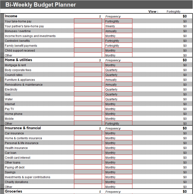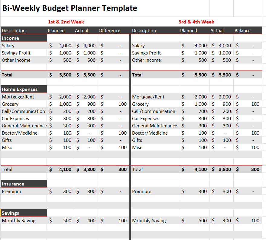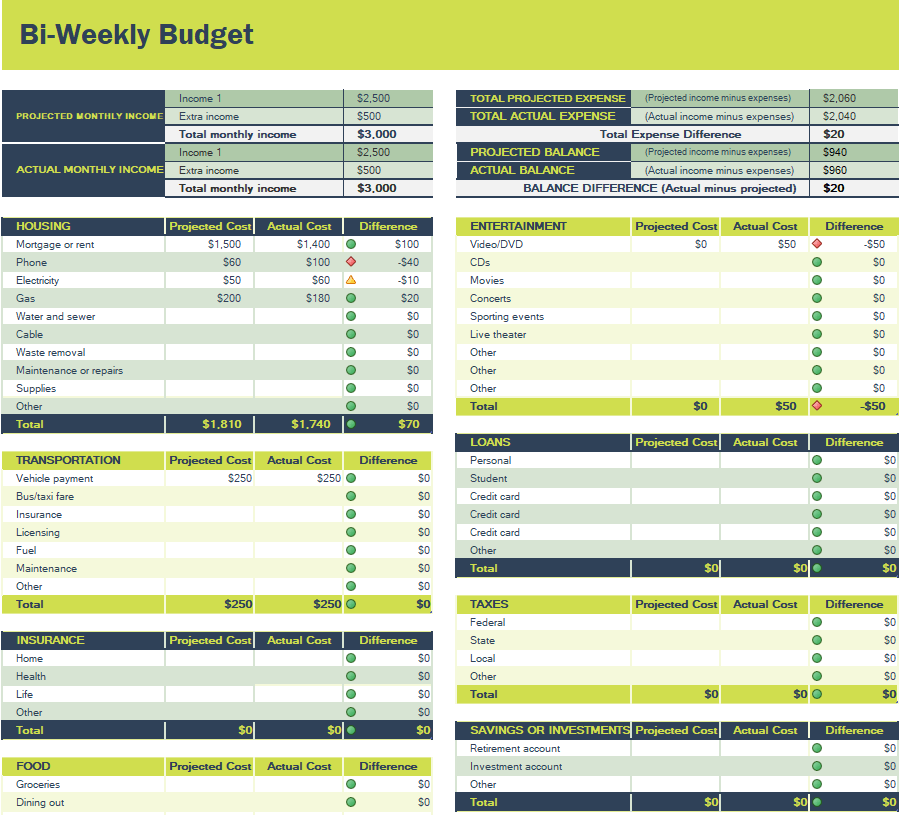 Bi-Weekly Budget Template in MS Excel