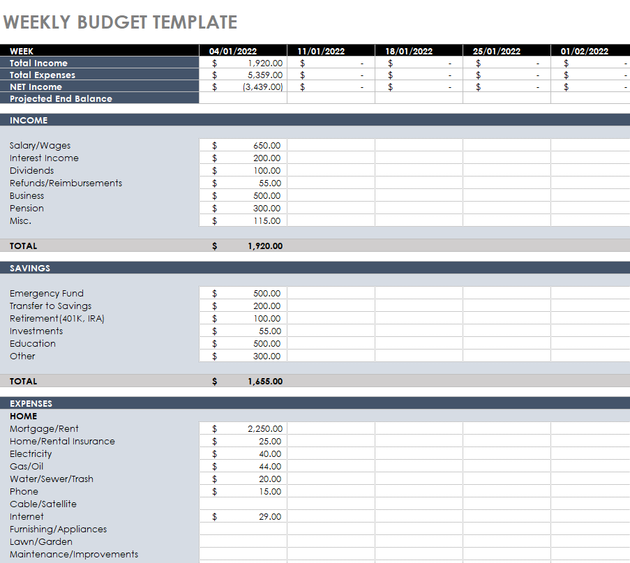 Editable Weekly Budget Sample in XLSX Format