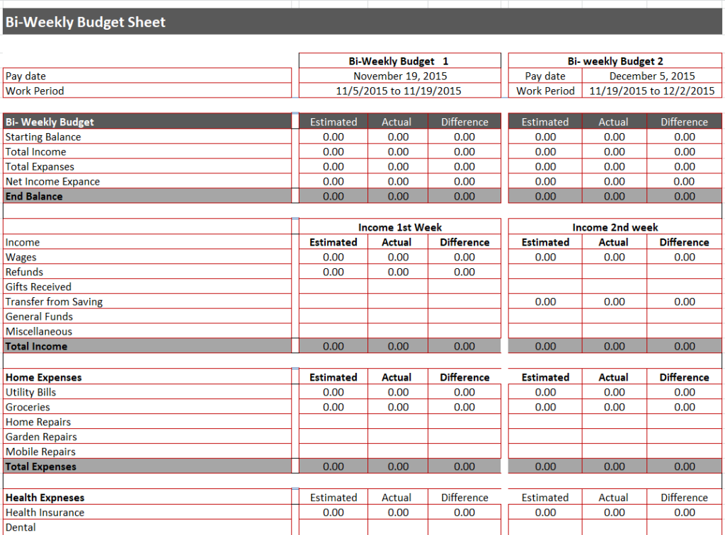Bi-Weekly Budget Sheet Template in MS Excel