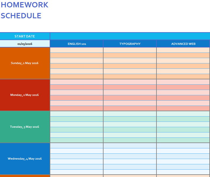 Homework Weekly Schedule Template