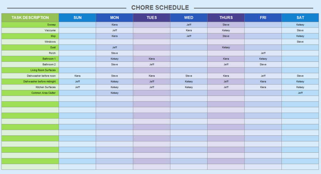 Weekly Chore Schedule Example in MS EXCEL